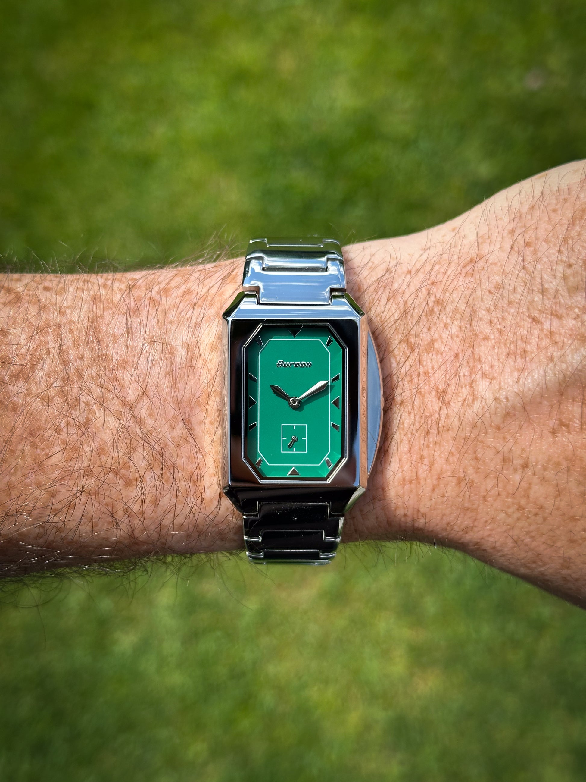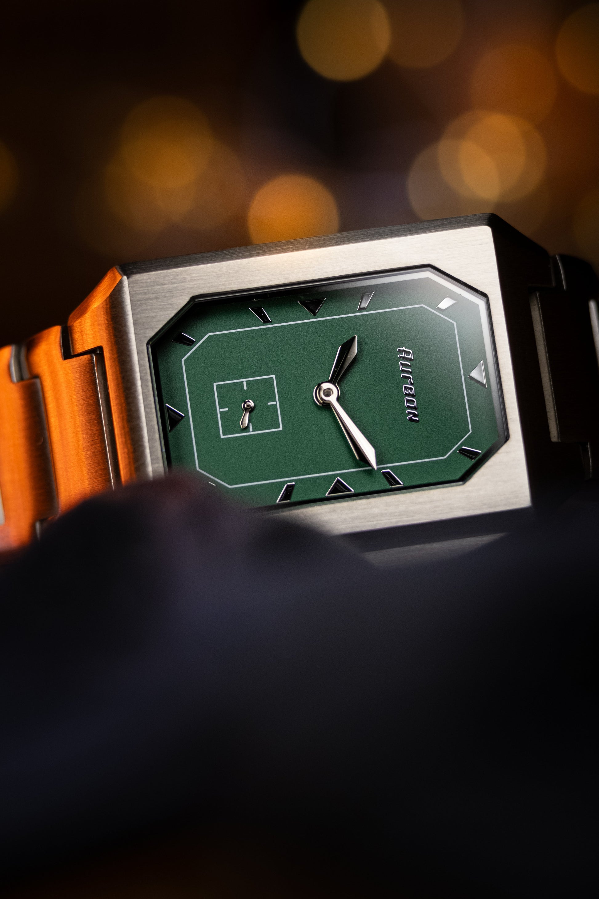 The crown is discreetly hidden within the asymmetric case, which gives it that special touch.